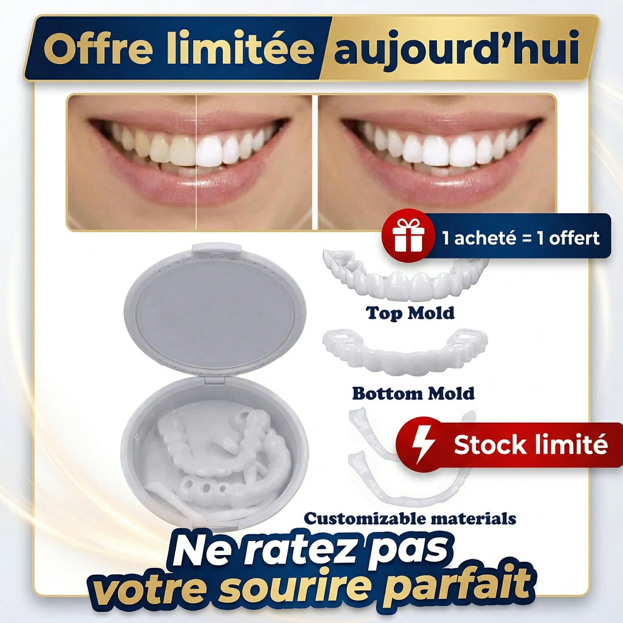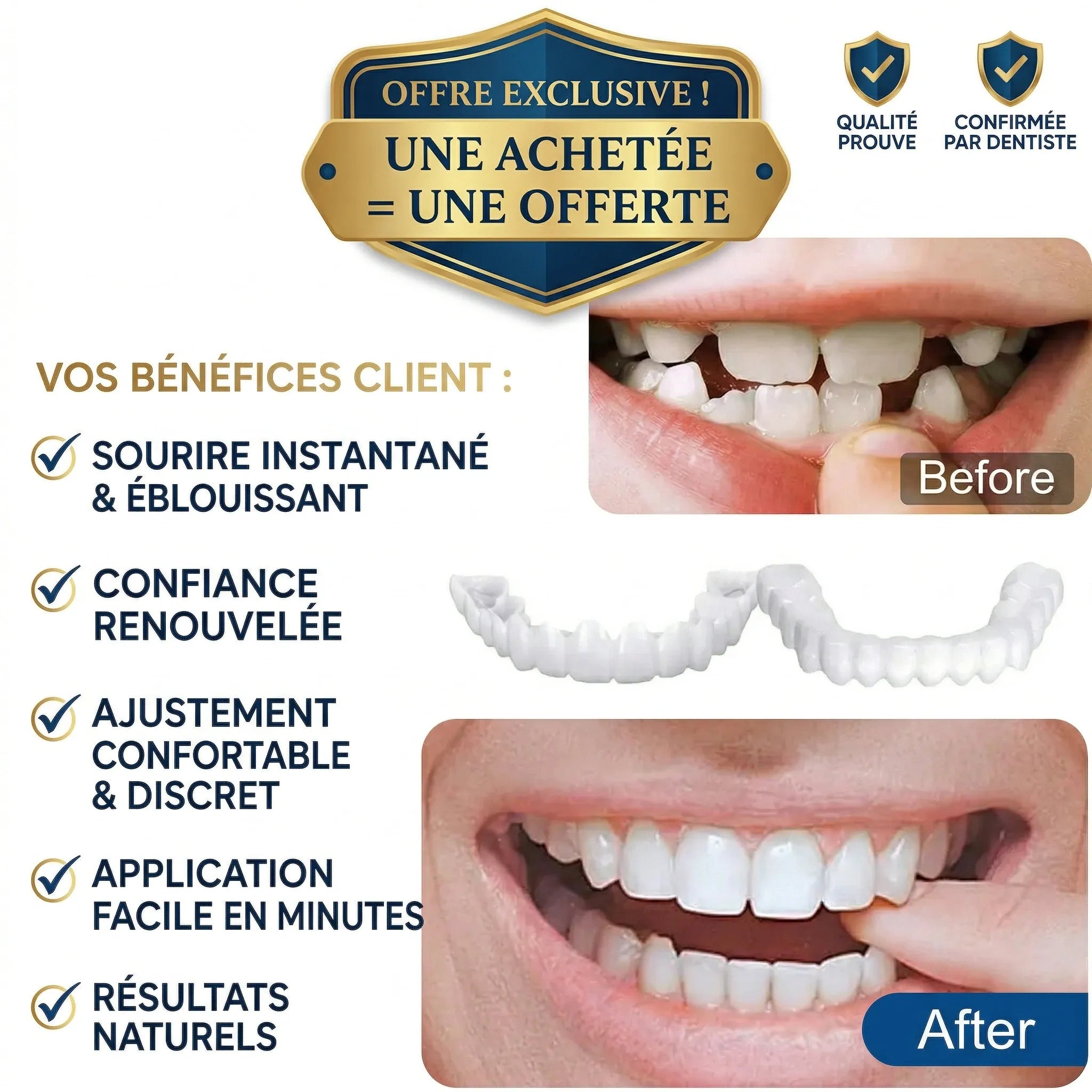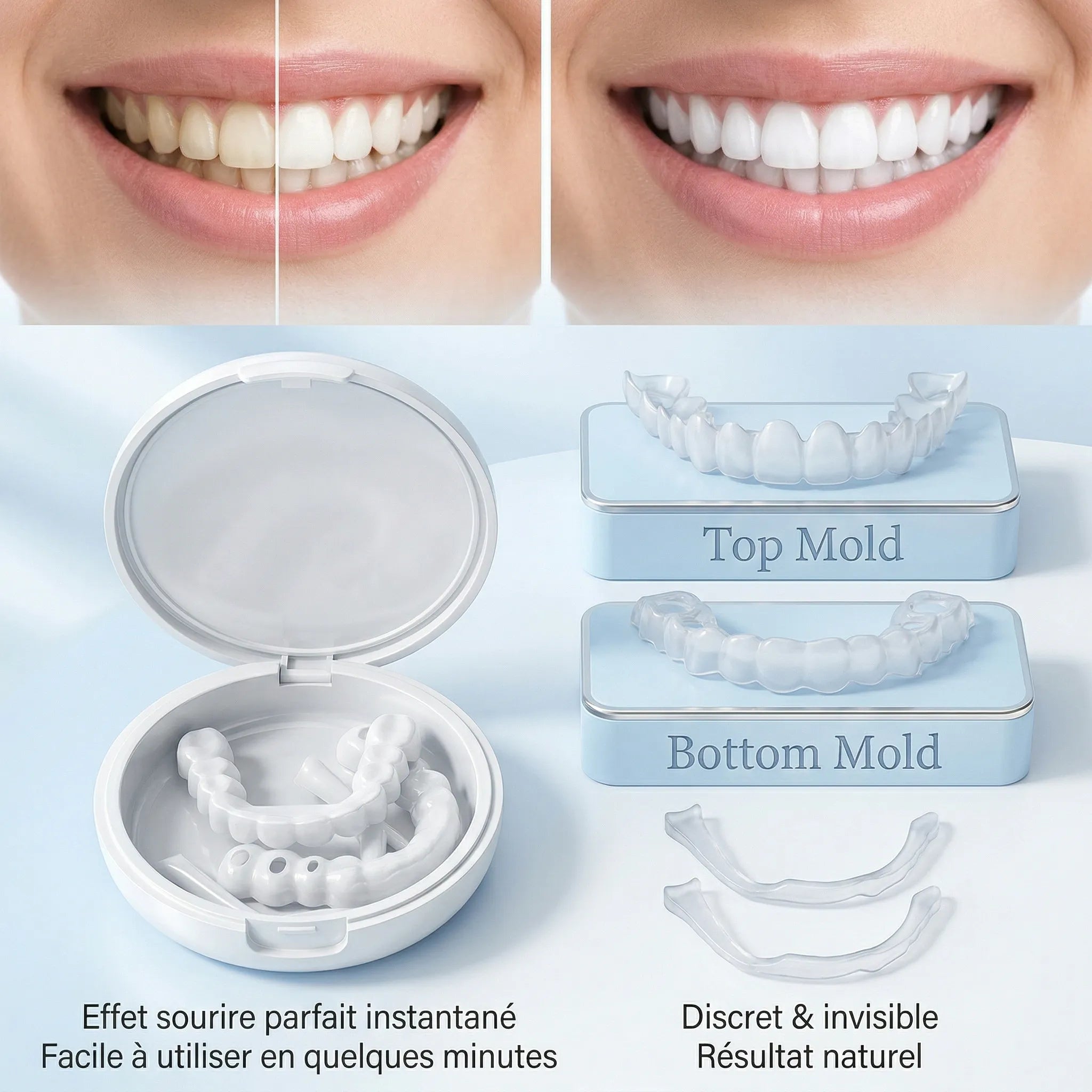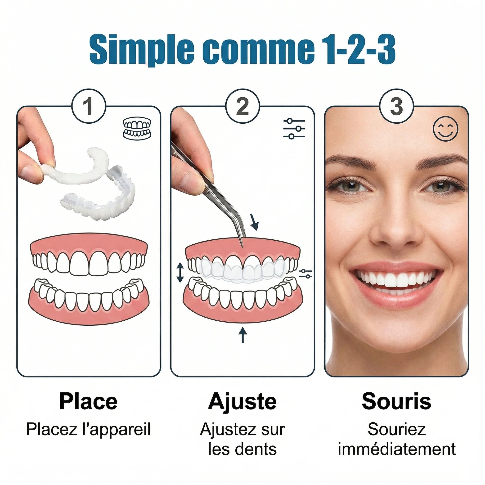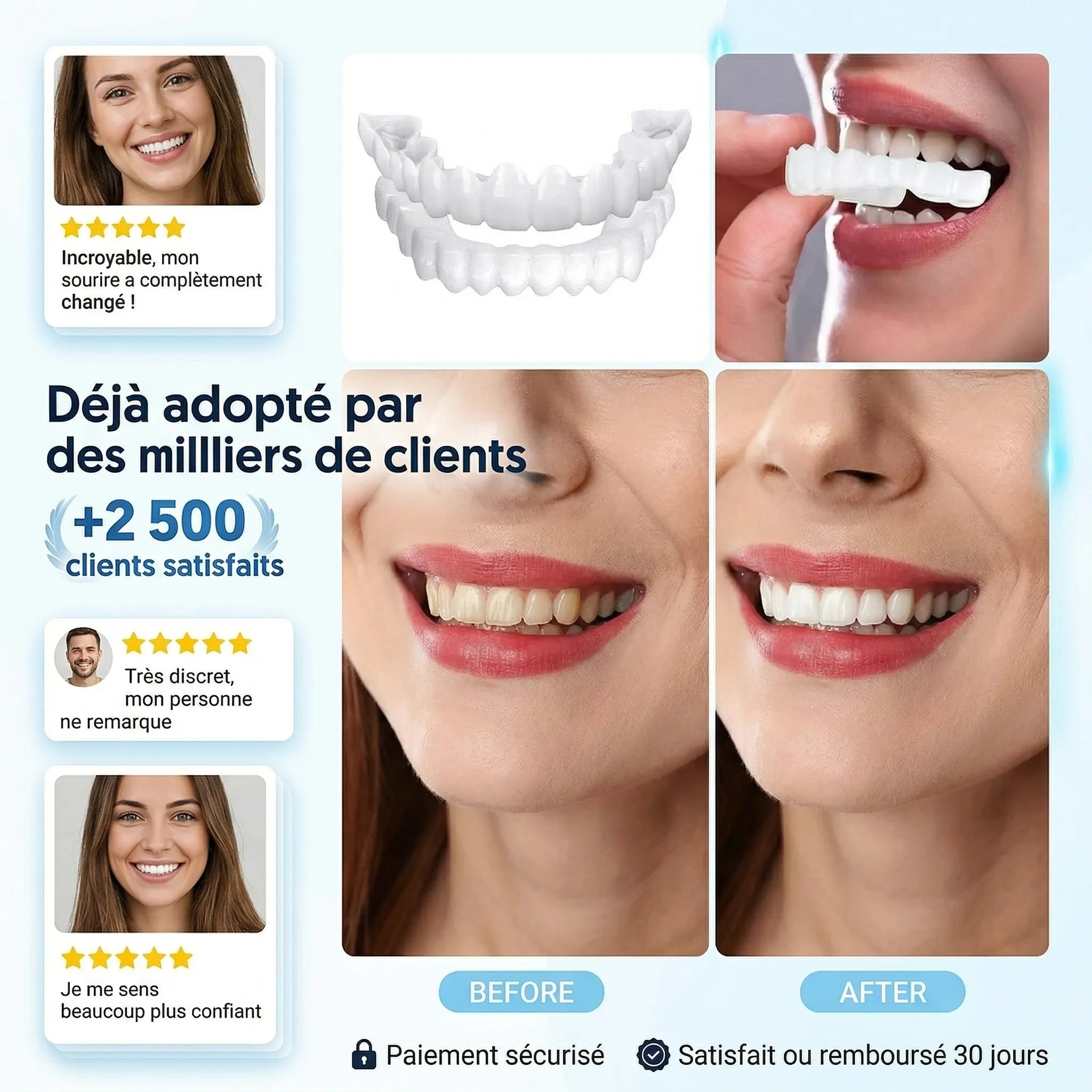 Incroyable ! Je viens juste de les recevoir et de les essayer, et je suis déjà émerveillé. La différence est spectaculaire. Je n'ai jamais eu un sourire aussi beau et naturel. C'est vraiment facile à mettre en place et le confort est immédiat. Je me sens déjà une nouvelle personne, prêt à affronter le monde avec un sourire éclatant. Un grand bravo à l'équipe, c'est un produit formidable !